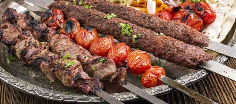 پیچاق قیمه با خلال بادام و تخممرغ- باسترما پلو با ماهیچه- شیشلیک- چلو کباب- مخلفاتی مانند دوغ و…